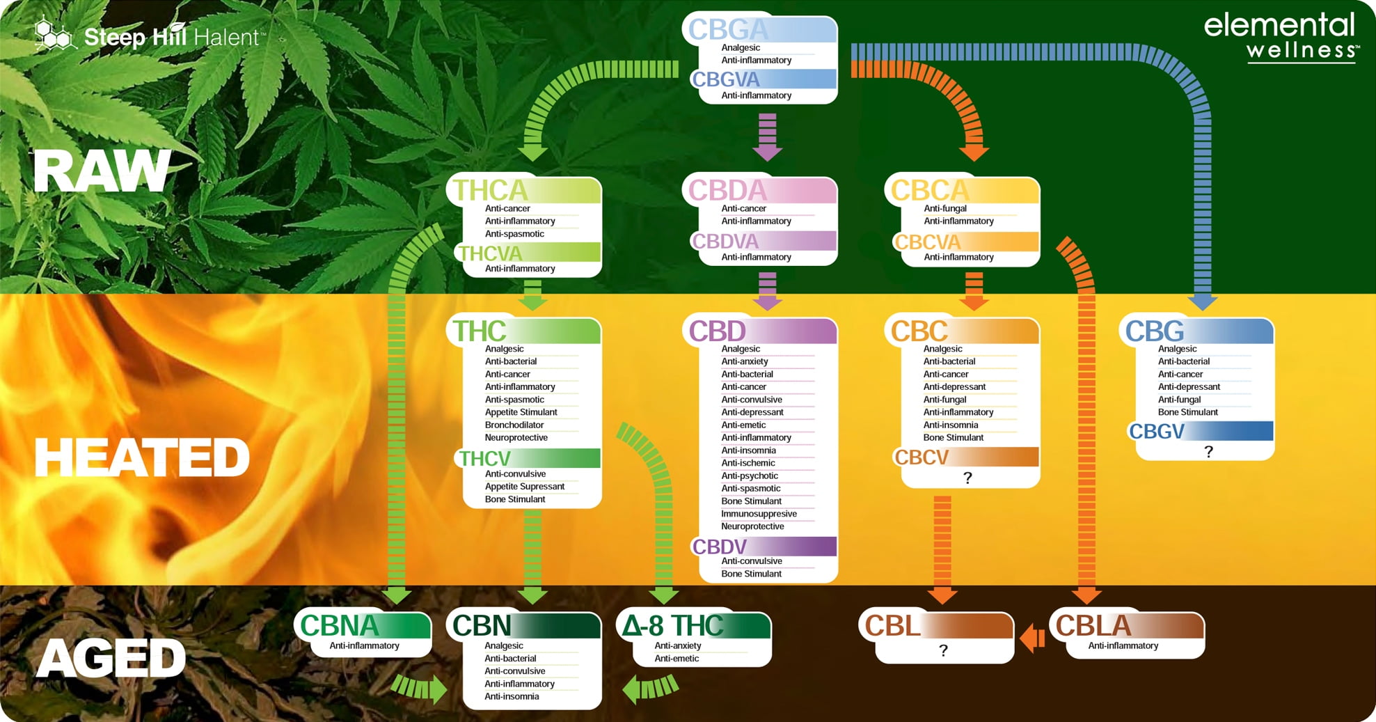 Fyzické a duševní výhody spalovaného konopí nejsou v dnešní době pro většinu lidí žádným tajemstvím, zejména v legálních státech a v lékařské komunitě. Méně známé jsou však výhody surového konopí, které nabízí zcela jiný soubor kanabinoidů. Společnost Steep Hill Labs to níže stručně nastiňuje popisem tří forem konopí (surové, zahřívané a sušené) a jejich příslušné biologické dostupnosti kanabinoidů.