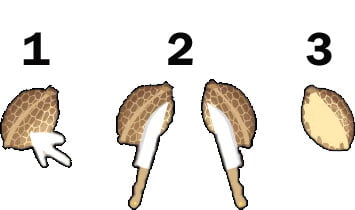 Die Samenschale besteht aus zwei Teilen, die am Umfang durch eine Naht verbunden sind. Die Seite, die stärker erhaben ist als die andere, ist der Grat. Ein verhärteter Grat kann das Öffnen des Samens erschweren. Um den Grat zu entfernen, fahren Sie mit einem scharfen Messer auf beiden Seiten entlang des Grats. Bei vorsichtiger Handhabung sollte er sich lösen, ohne das Innere des Samens zu beschädigen.