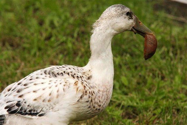 Diese mageren, fleischfressenden Enten lieben Schnecken und sind die einzigen, die vor ihnen nicht zurückschrecken. Hunger ist offenbar der beste Koch. Wie alle Enten fressen auch die Indischen Läufer Grünzeug, und der Garten muss an sie angepasst werden, wozu auch etwas Wasser gehört. Eine Ente sammelt im Durchschnitt fast 1 kg Schnecken oder Nacktschnecken pro Tag.