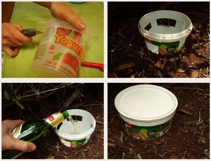 Wenn Sie nicht in eine richtige Falle investieren wollen, Ihr Bier gerne mit anderen teilen und sich nicht scheuen, tote Schnecken aus der Schale zu klauben, können Sie versuchen, Ihre eigene Bierfalle zu installieren. Gießen Sie einfach Bier in eine tiefere Schale und stellen Sie mehrere dieser Schalen im Garten auf, teilweise eingegraben. Idealerweise stellen Sie ein Vordach aus einem Stück Brett über die Schale, vielleicht mit zwei Steinen an einer Seite, damit die Schnecken bequem unter das Vordach gelangen können. Der Biergeruch lockt die Schnecken an, und sie kommen nicht aus der Schale heraus. Morgens können Sie um die Falle herumgehen und die toten Schnecken entfernen oder die in der Bierschlange wartenden Schnecken aufsammeln. Bereiten Sie sich darauf vor, das Bier regelmäßig nachzufüllen und die schleimigen Schneckenkörper zu behandeln.