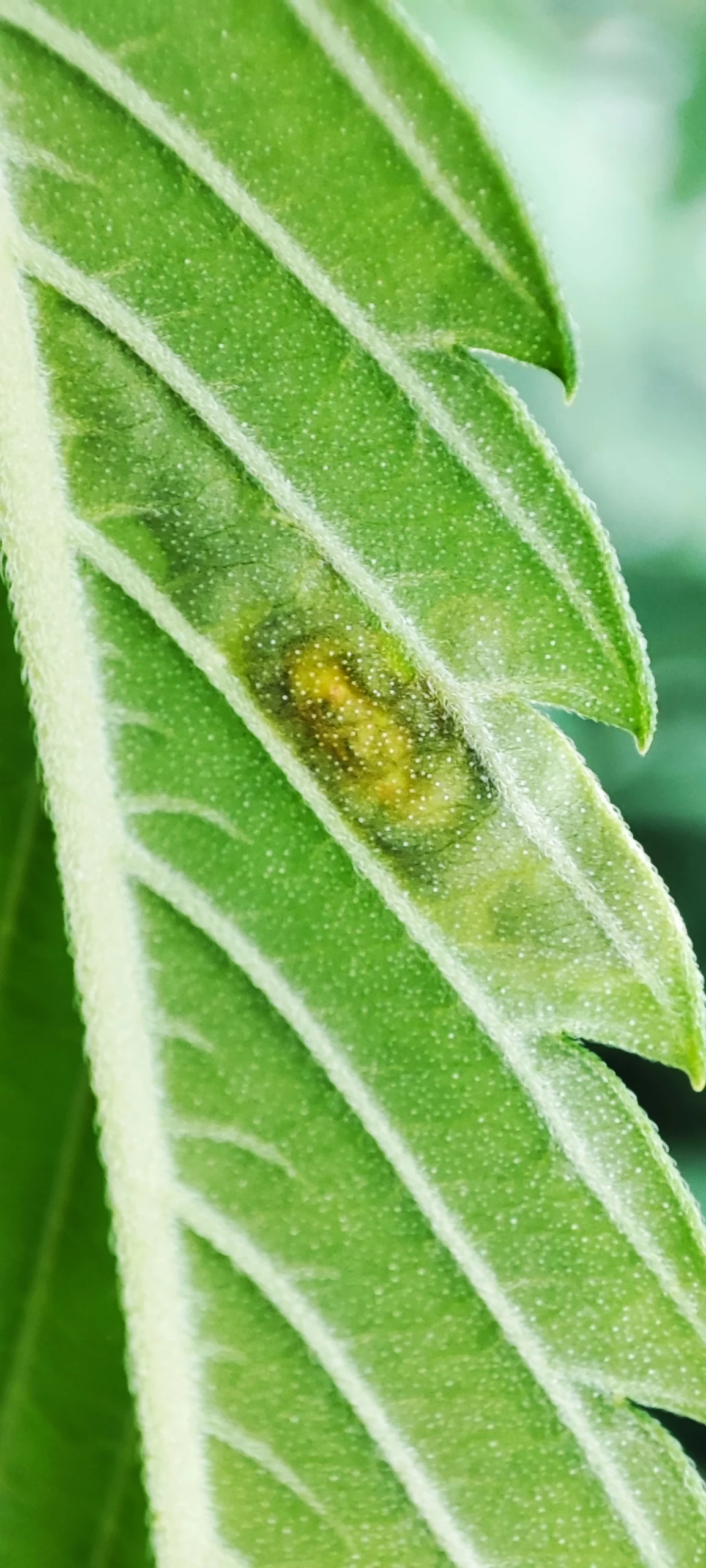 Wenn Sie auf Ihren Marihuanablättern stark eingewickelte Bahnen gefunden haben, sind Ihre Cannabispflanzen wahrscheinlich von Agromyzidae befallen worden. Diese Schädlinge verursachen weißliche Wunden auf der Oberseite der Blätter, die sich allmählich ausdehnen und trockene braune Flecken mit einigen schwarzen Flecken innerhalb dieser Bahnen bilden.
